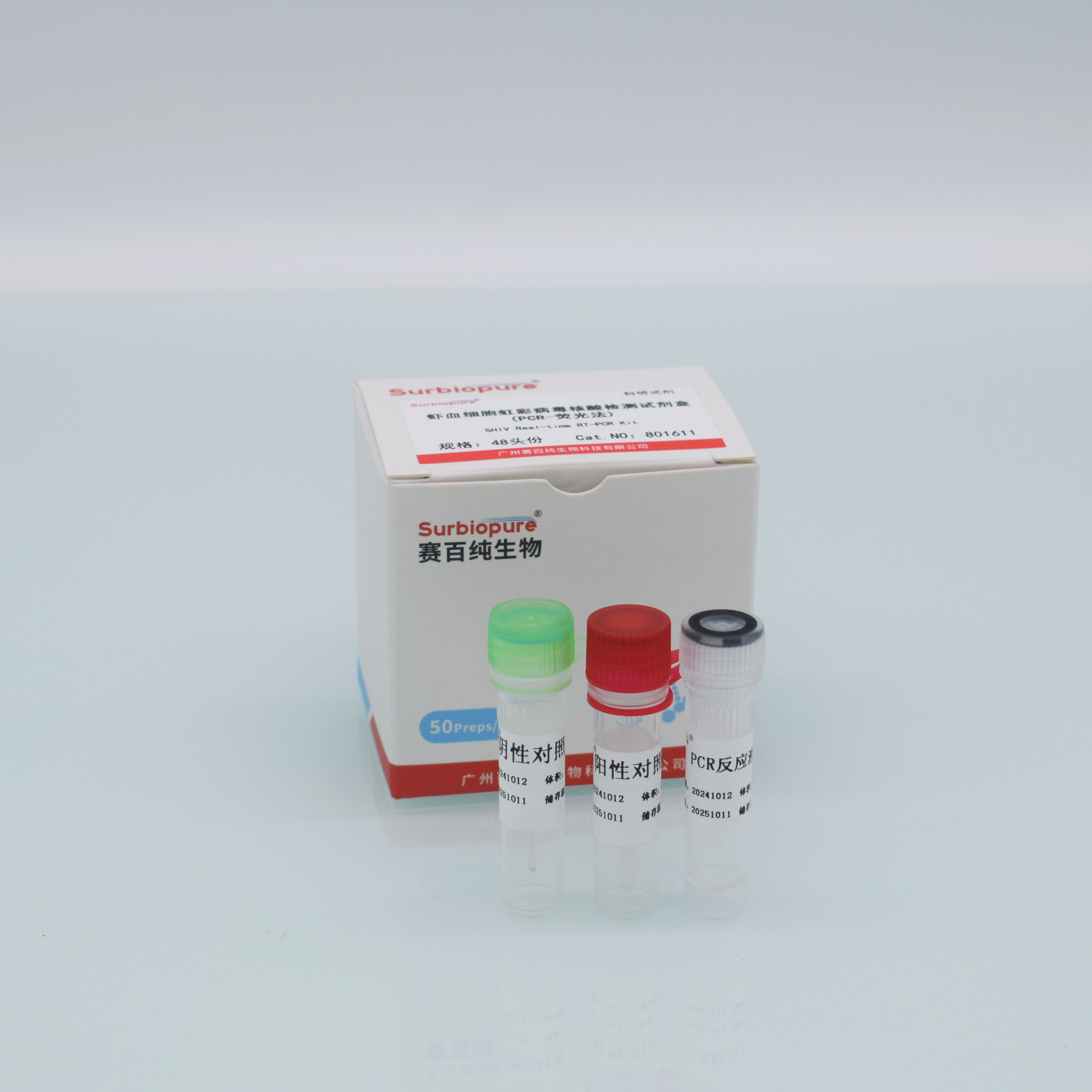 【產品名稱】 通用名稱:蝦血細胞虹彩病毒核酸檢測試劑盒(PCR-熒光法) 英文名稱:SHIV Real-time PCR Kit 【包裝規(guī)格】 48頭份/盒 【預期用途】 本品適用于對蝦、養(yǎng)殖水體中、養(yǎng)殖土壤中、飼料等中蝦血細胞虹彩病毒病原體的快速檢測。 【檢驗原理】 本試劑盒利用實時熒光PCR檢測技術,采用蝦血細胞虹彩病毒(SHIV)的一對特異性引物和一條特異性熒光探針,實現對對蝦、養(yǎng)殖水體中、養(yǎng)殖土壤中、飼料等中蝦血細胞虹彩病毒病原體的快速檢測。801611