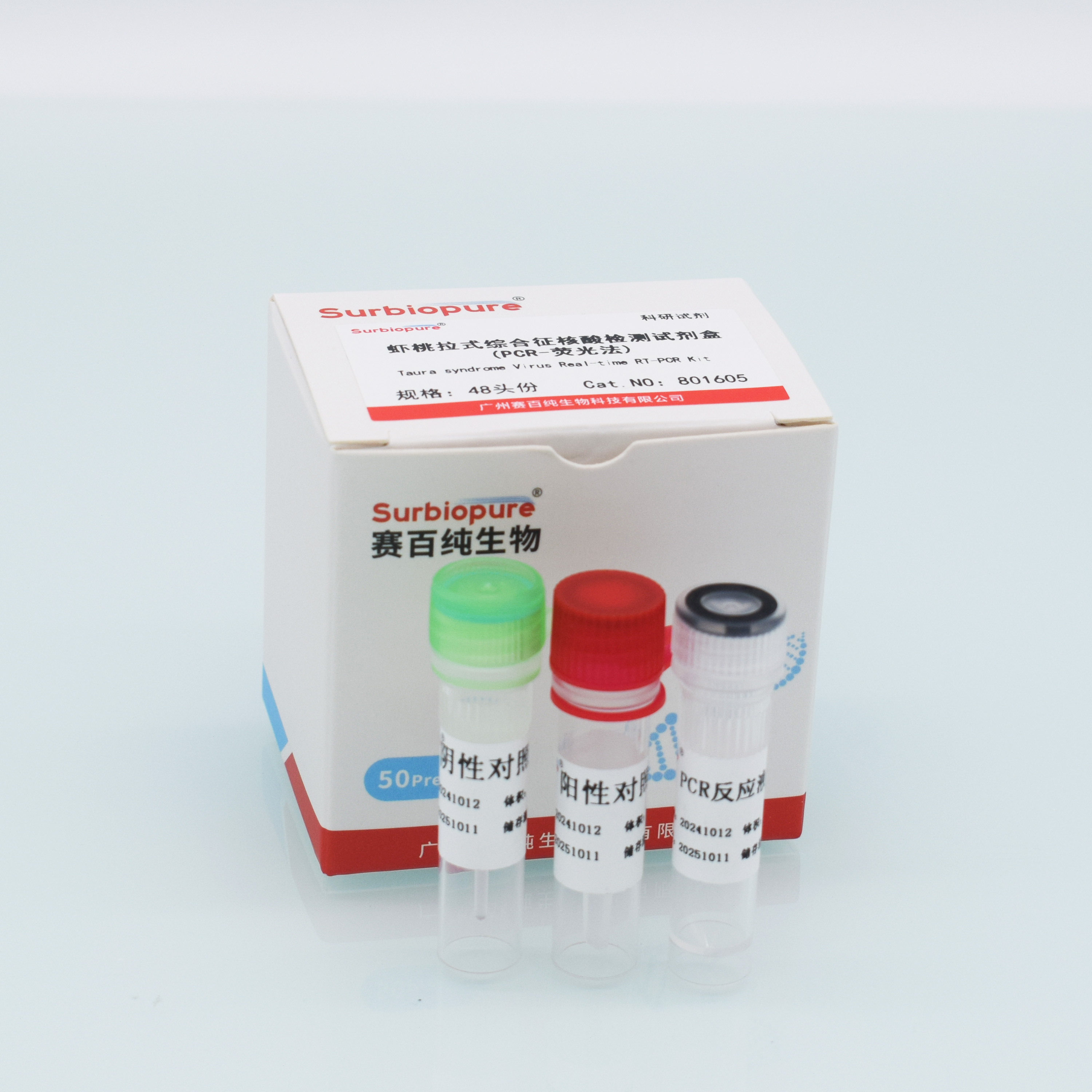 【產(chǎn)品名稱】 通用名稱:蝦桃拉式綜合征核酸檢測試劑盒(RT-PCR 熒光法) 英文名稱:TSV Real-time RT-PCR Kit 【包裝規(guī)格】 48頭份/盒 【預(yù)期用途】 本品適用于對蝦、養(yǎng)殖水體中、養(yǎng)殖土壤中、飼料等中蝦桃拉式綜合征病原體的快速檢測。 【檢驗原理】 本試劑盒利用實時熒光PCR檢測技術(shù),采用蝦桃拉式綜合征(TSV)的一對特異性引物和一條特異性熒光探針,實現(xiàn)對對蝦、養(yǎng)殖水體中、養(yǎng)殖土壤中、飼料等中蝦桃拉式綜合征病原體的快速檢測。801605