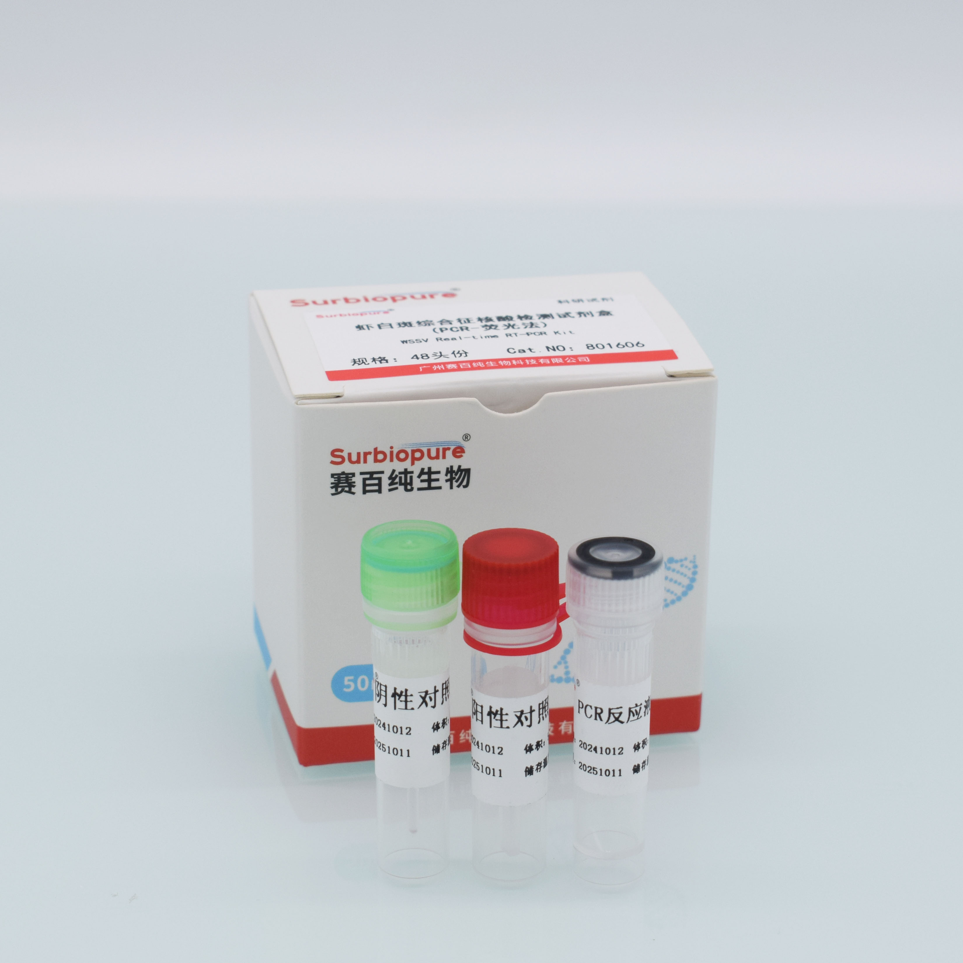 【產(chǎn)品名稱】 通用名稱:蝦白斑綜合癥核酸檢測試劑盒(PCR-熒光法) 英文名稱:WSSV Real-time PCR Kit 【包裝規(guī)格】 48頭份/盒 【預(yù)期用途】 本品適用于對蝦、養(yǎng)殖水體中、養(yǎng)殖土壤中、飼料等中蝦白斑綜合癥病原體的快速檢測。 【檢驗原理】 本試劑盒利用實時熒光PCR檢測技術(shù),采用蝦白斑綜合癥(WSSV)的一對特異性引物和一條特異性熒光探針,實現(xiàn)對對蝦、養(yǎng)殖水體中、養(yǎng)殖土壤中、飼料等中蝦白斑綜合癥病原體的快速檢測。801606