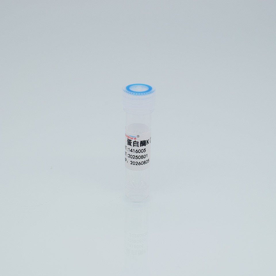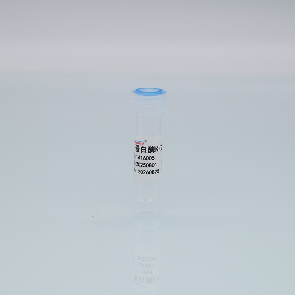 蛋白酶K(Proteinase K),相對分子量約為29.3 kDa, 是一種切割活性較廣的絲氨酸蛋白酶??汕懈钪灏被岷头枷阕灏被岬聂然穗逆I,應(yīng)用廣泛,可用于制備脈沖電泳的染色體DNA,蛋白質(zhì)印跡以及去除DNA和RNA制備中的核酸酶等實驗,蛋白酶K的一般工作濃度是50—100μg /ml。因蛋白酶K在變性劑如SDS(1%)中可提高其活性,所以在使用中,常根據(jù)所用緩沖液是否含有SDS、尿素、pH、溫度等因素確定具體的工作濃度。蛋白酶K在較廣的pH范圍內(nèi)(pH 4-12.5)均有活性。